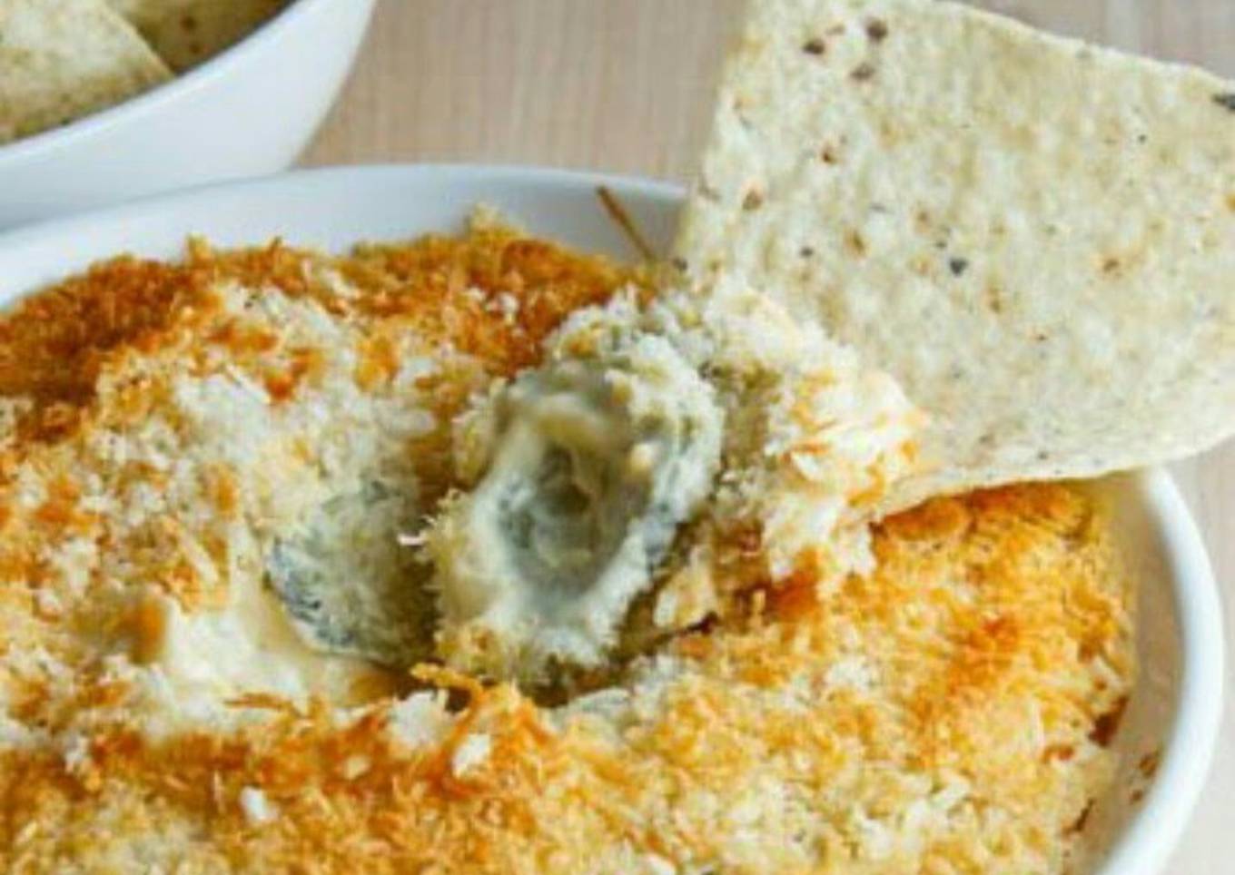 - Spread cheese pepper filling in pie pan, top with the panko mixture. Bake at 375 25-30 min until bubbling around the edges serve with tortilla chips